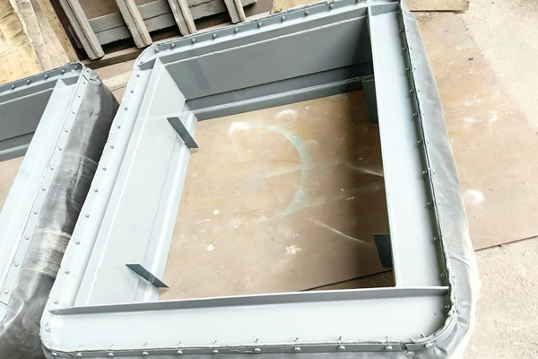 本文中所展示的圖片是我們翔盛環??萍脊窘谡跒樯綎|客戶生產制作的一批矩形非金屬補償器(矩形非金屬膨脹節)。非金屬補償器通常由纖維織物蒙皮(硅膠為紅色、氟膠為黑色)與管道接口形狀相同的金屬框架、以及其它的結構件所組成。